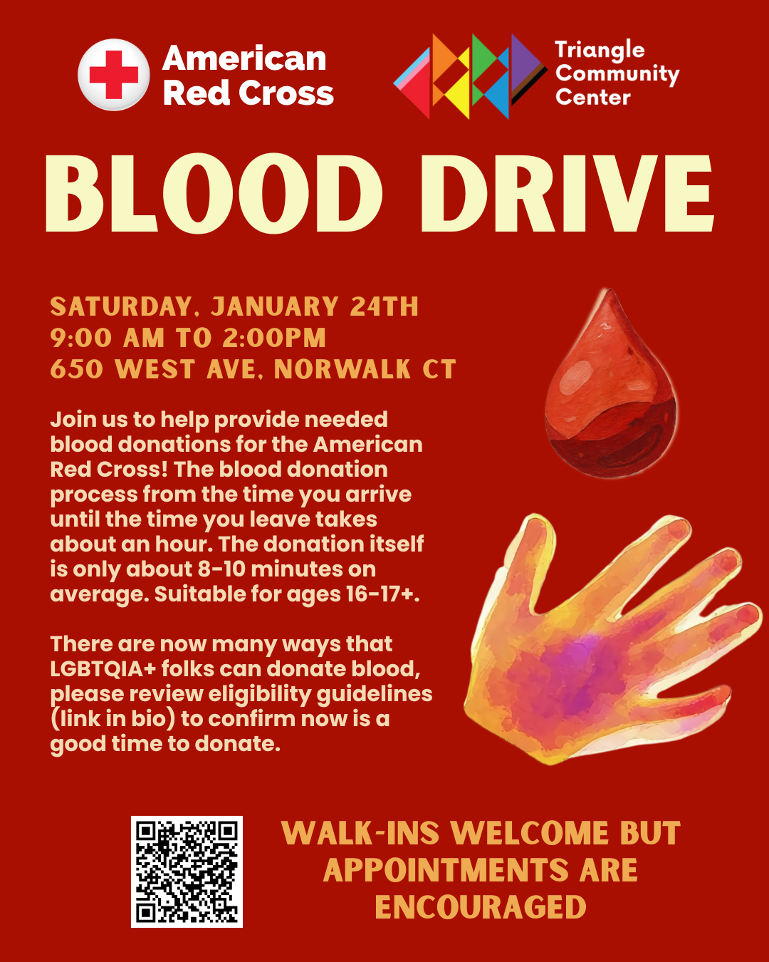 There are now many ways that LGBTQIA+ folks can donate blood, please review these eligibility guidelines to know if you're currently a good fit to donate. We are accepting walk ins but appointments are highly encouraged to secure your spot.